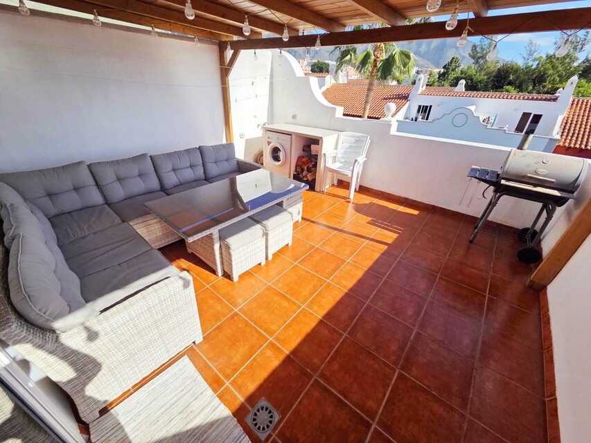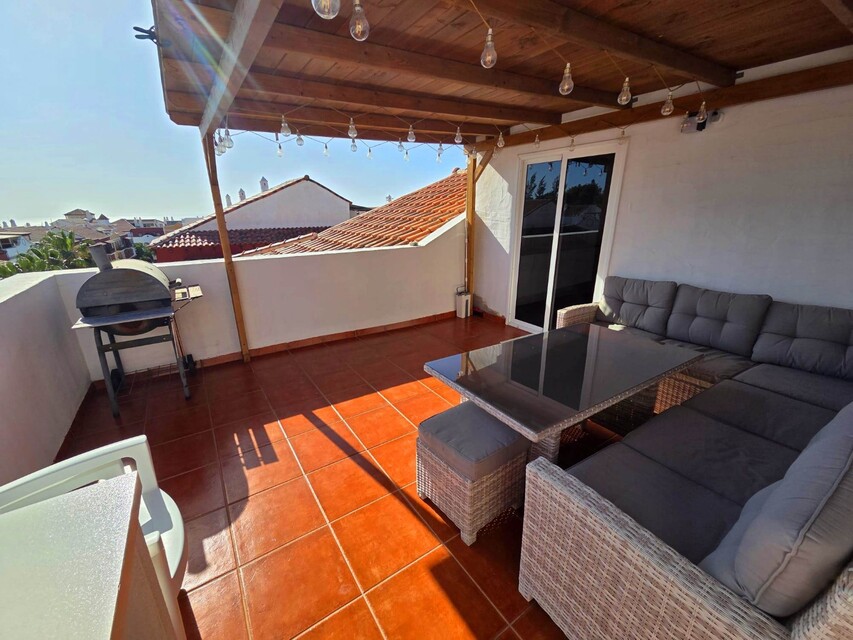 Tríplex en Residencial Jardín Botánico I, Adeje, con 173 m² distribuidos en 4 dormitorios, 3 baños y 1 aseo, amplio salón y cocina independiente con comedor. Cuenta con terraza con jardín de 16,5 m² y una espectacular azotea con zona cerrada de 12,5 m² (segunda cocina y almacenaje) y terraza abierta de 19,5 m² con barbacoa.